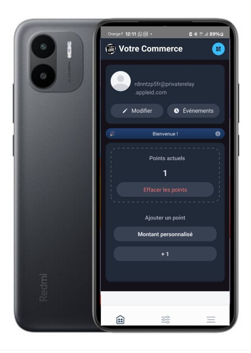 Du côté client, une fois qu'il aura validé son adresse mail lors de son premier scan, il pourra en plus, si vous le souhaitez, scanner votre QR code à chaque achat pour cumuler des points ...